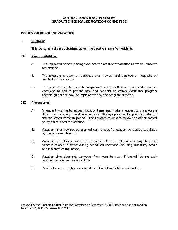 - Policy on Resident Vacation