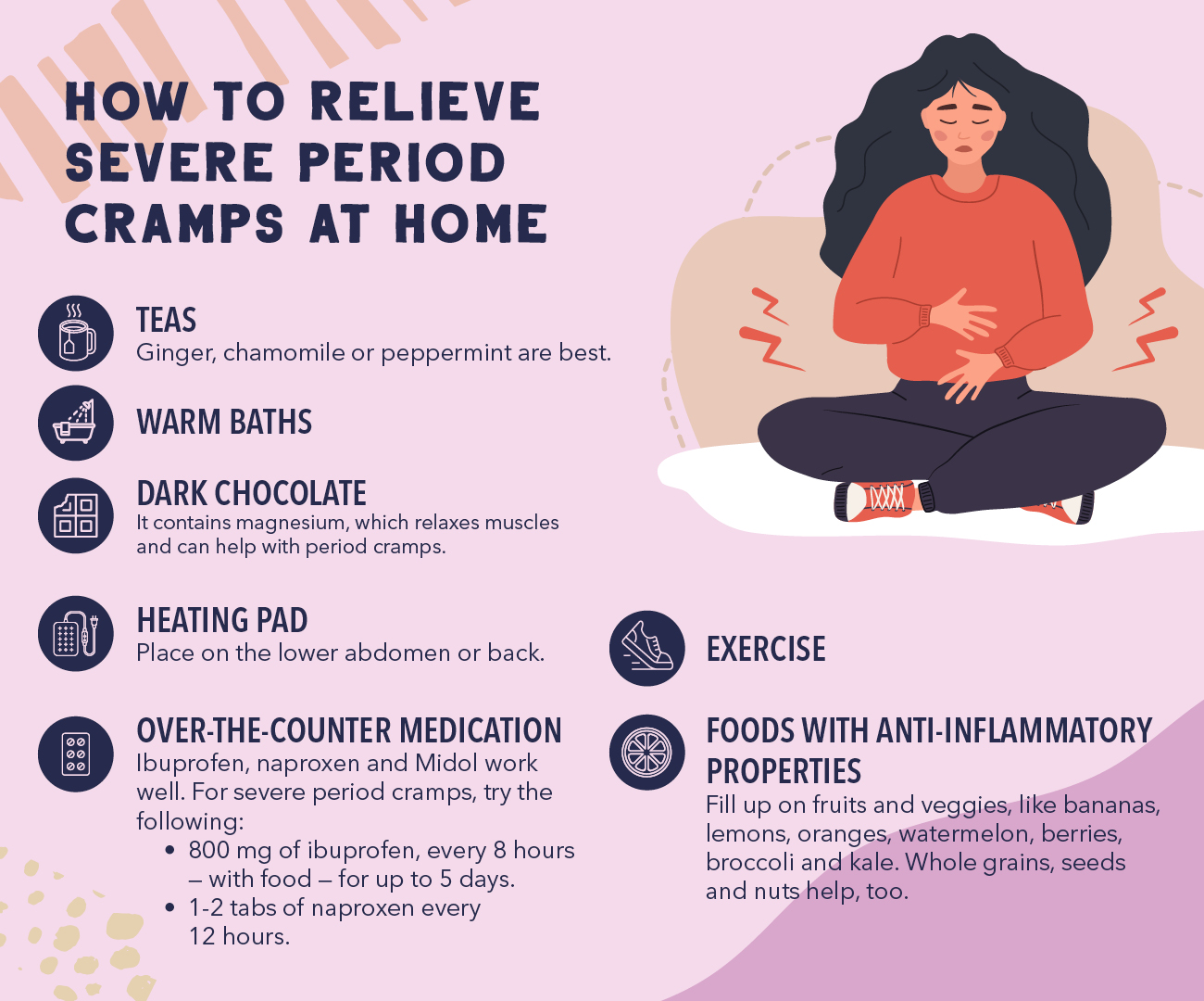 If your period cramps are severe, talk to your provider to discuss options, like starting a birth control method to help with your cramps and assessing for any underlying conditions. Additionally, let your doctor know if you experience any of the following: